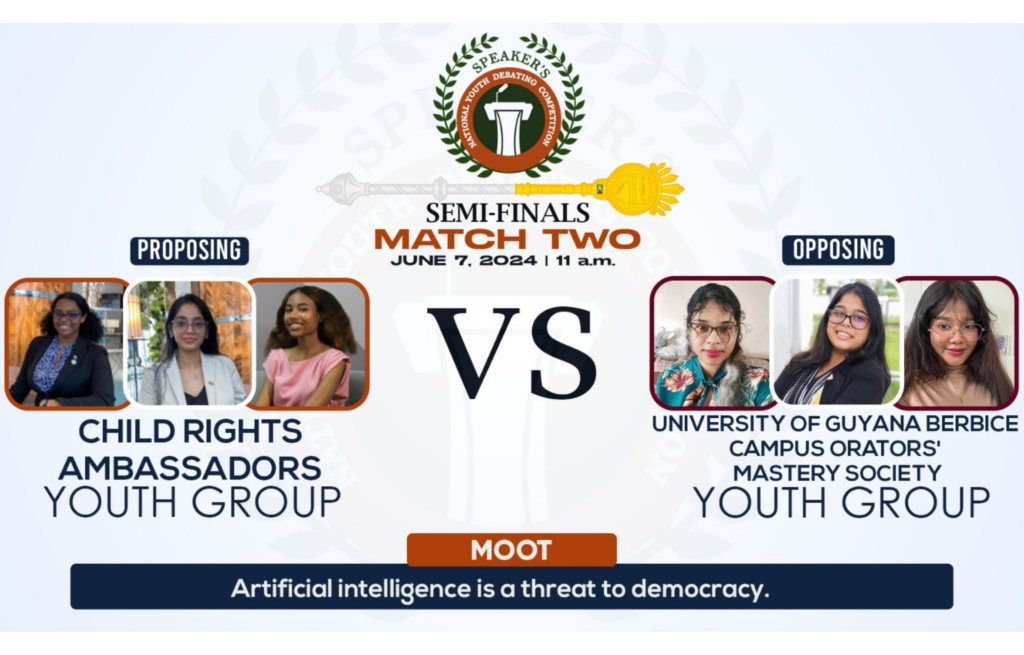 In a captivating semifinal showdown of the Speaker’s National Youth Debating Competition, the Child Rights Ambassadors Youth Group emerged victorious, securing a spot in the finals against the University of Guyana Berbice Campus Orators’ Youth Group.