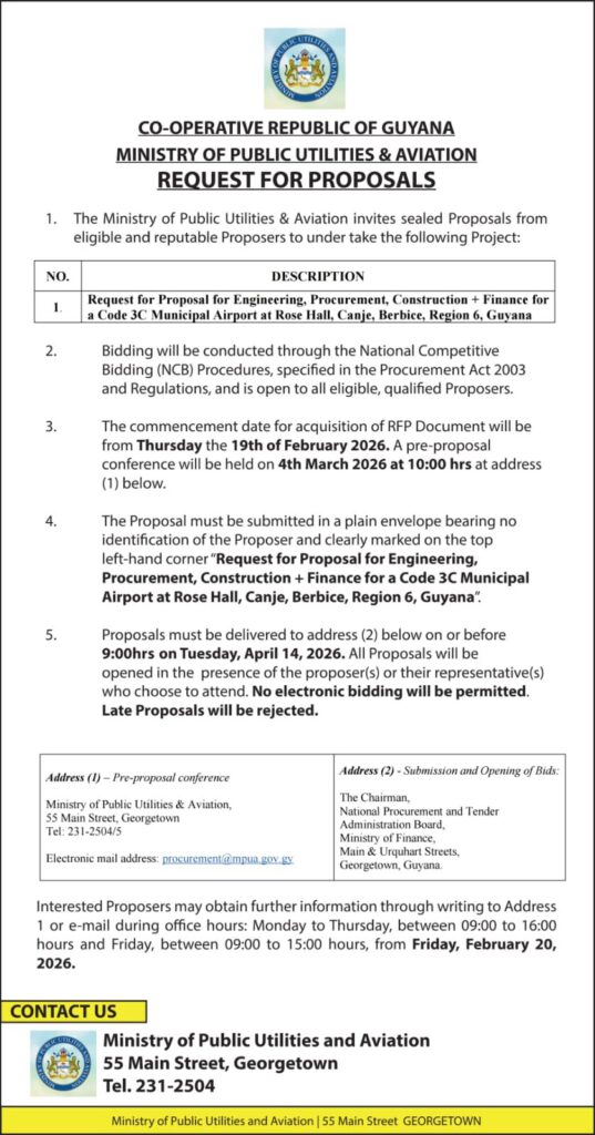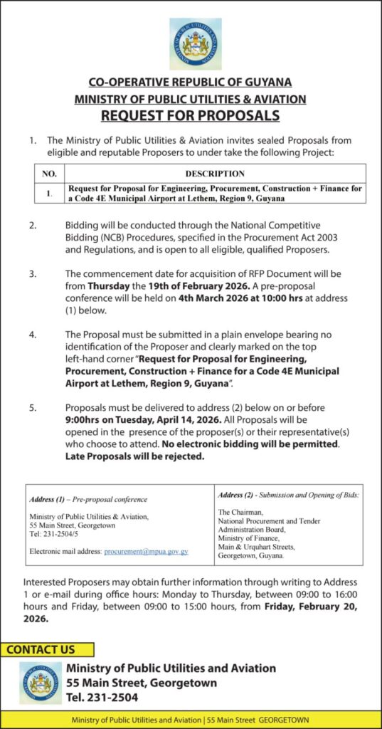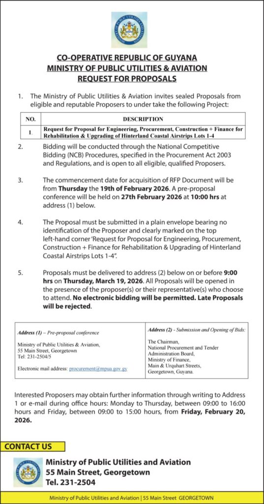 Interested bidders can begin acquiring the necessary documents starting Thursday, February 19, 2026. To ensure all potential contractors have a clear understanding of the project requirements, a pre-proposal conference has been scheduled for March 4, 2026, at 10:00 hrs at the Ministry office located at 55 Main Street in Georgetown.