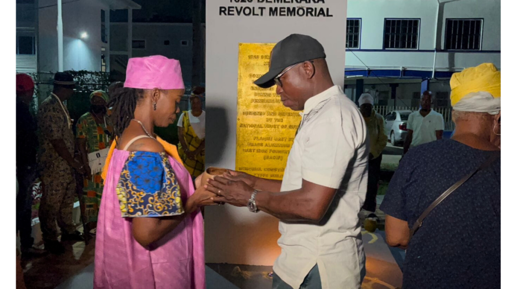 The ceremony was marked by traditional dancing and singing, accompanied by the rhythmic beats of drums, reflecting the deep cultural significance of libation in Guyana’s African heritage.