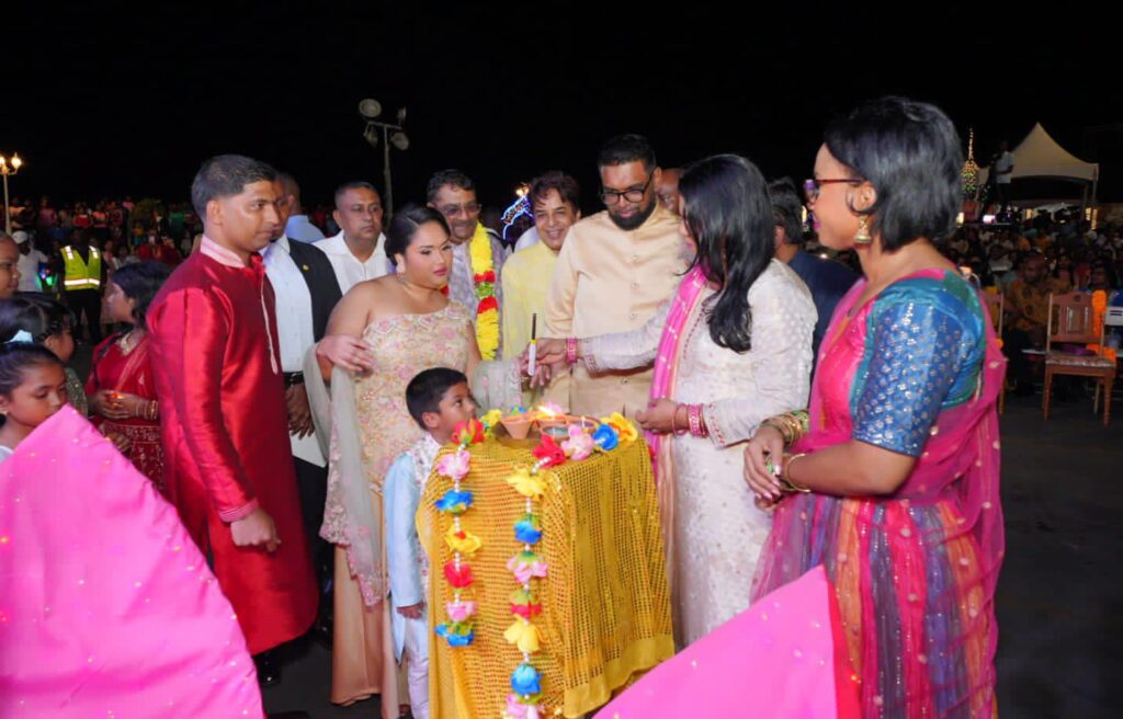 President Irfaan Ali joined hundreds of citizens at the Corriverton Recreational Park for the ‘One Guyana’ Diwali Jalsa on Tuesday evening, celebrating the upcoming Diwali festivities scheduled for the weekend.